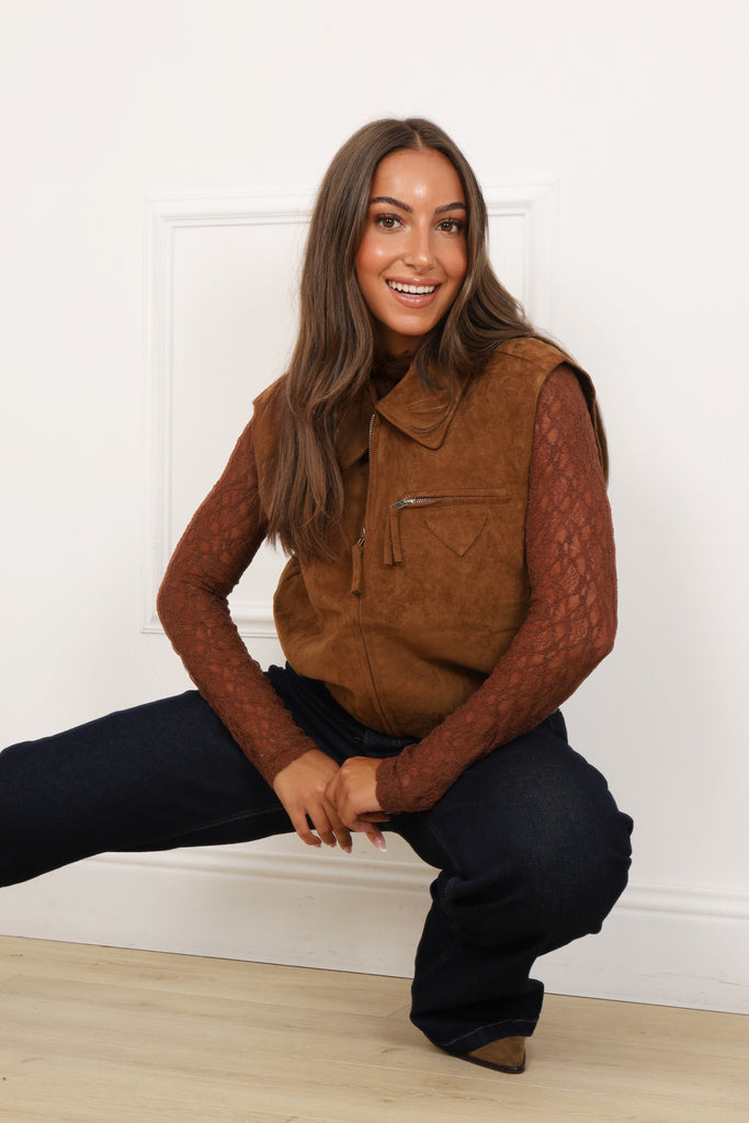 Osez un style audacieux avec le gilet Palma, en suédine douce et sans manches. Sa fermeture zippée apporte une touche moderne et pratique, parfaite pour une allure affirmée et pleine de caractère.