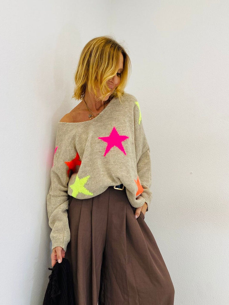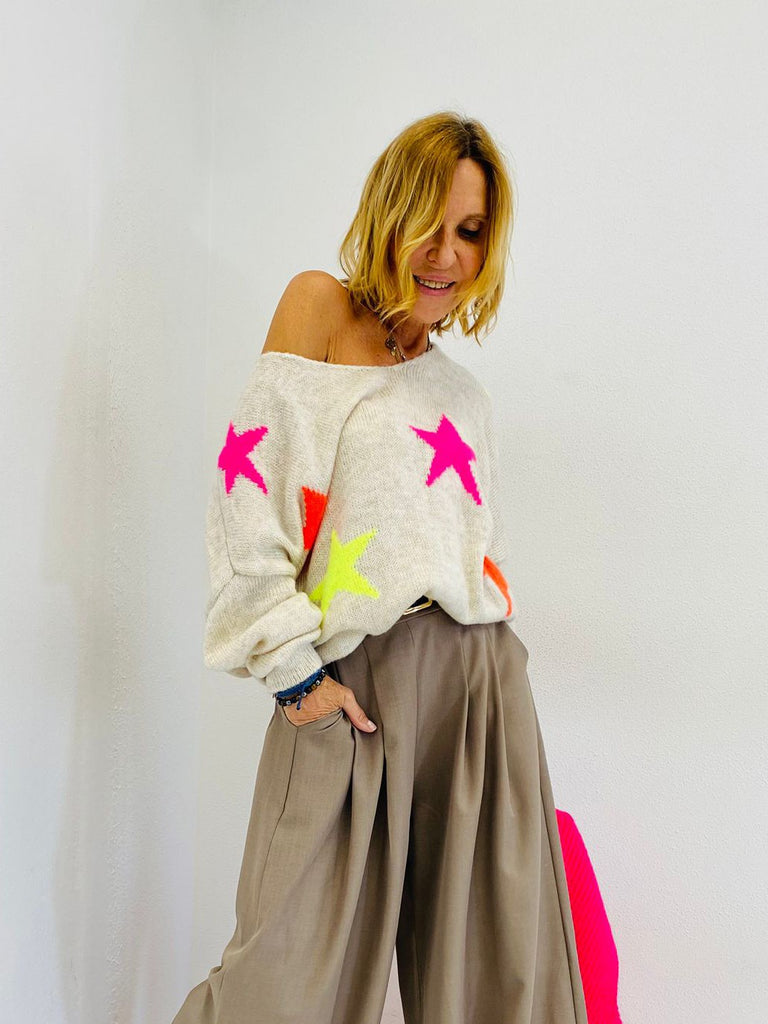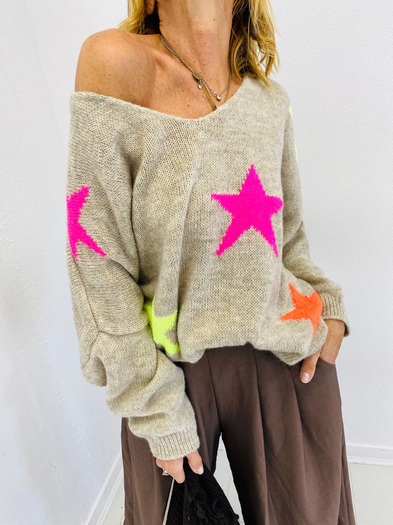 Un joli pull en lainage tout doux, col en V, avec des étoiles en couleur imprimées.