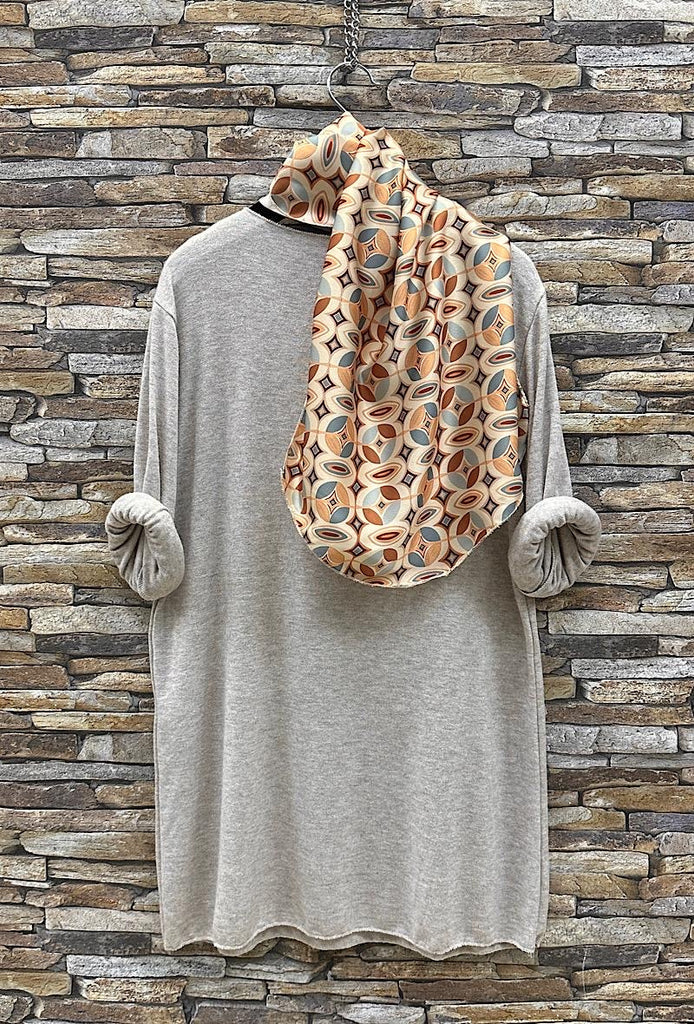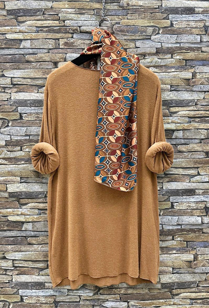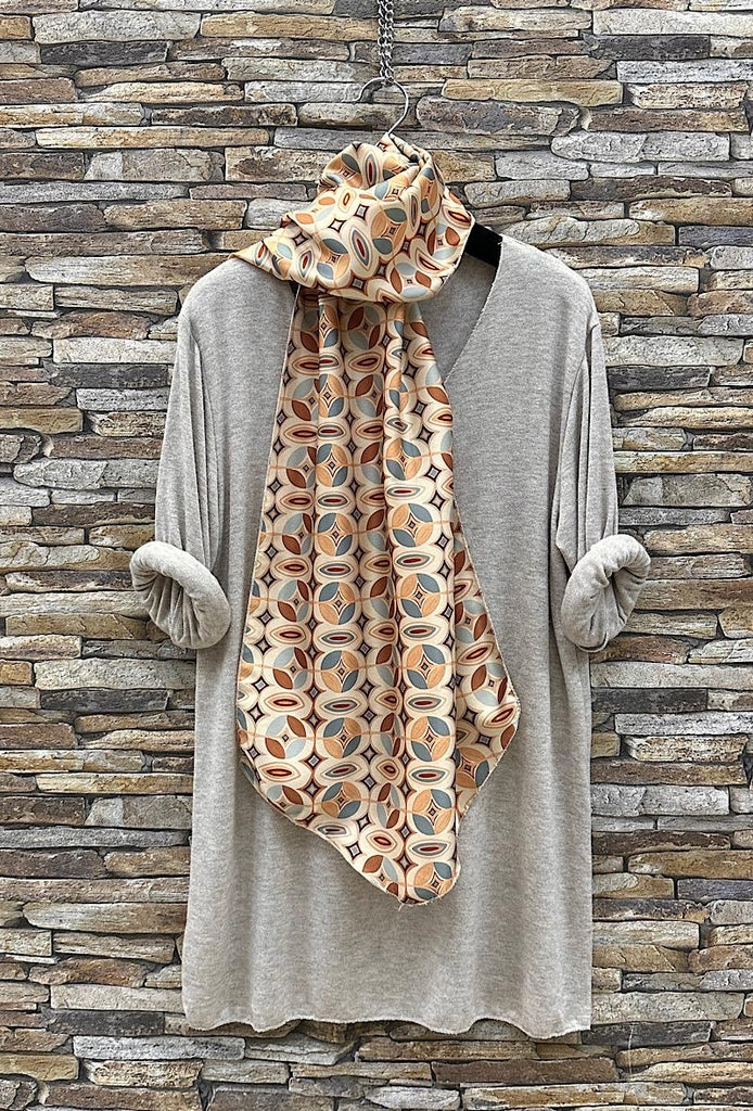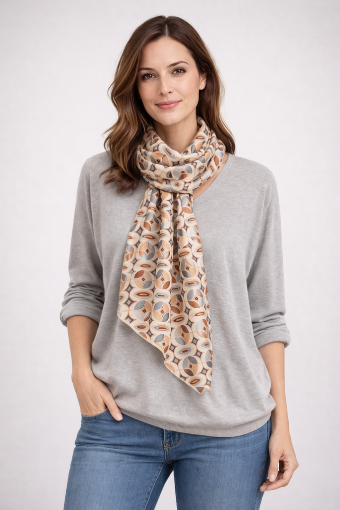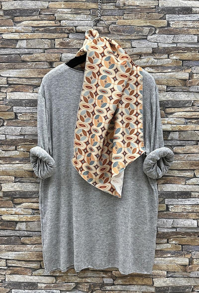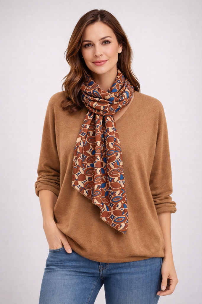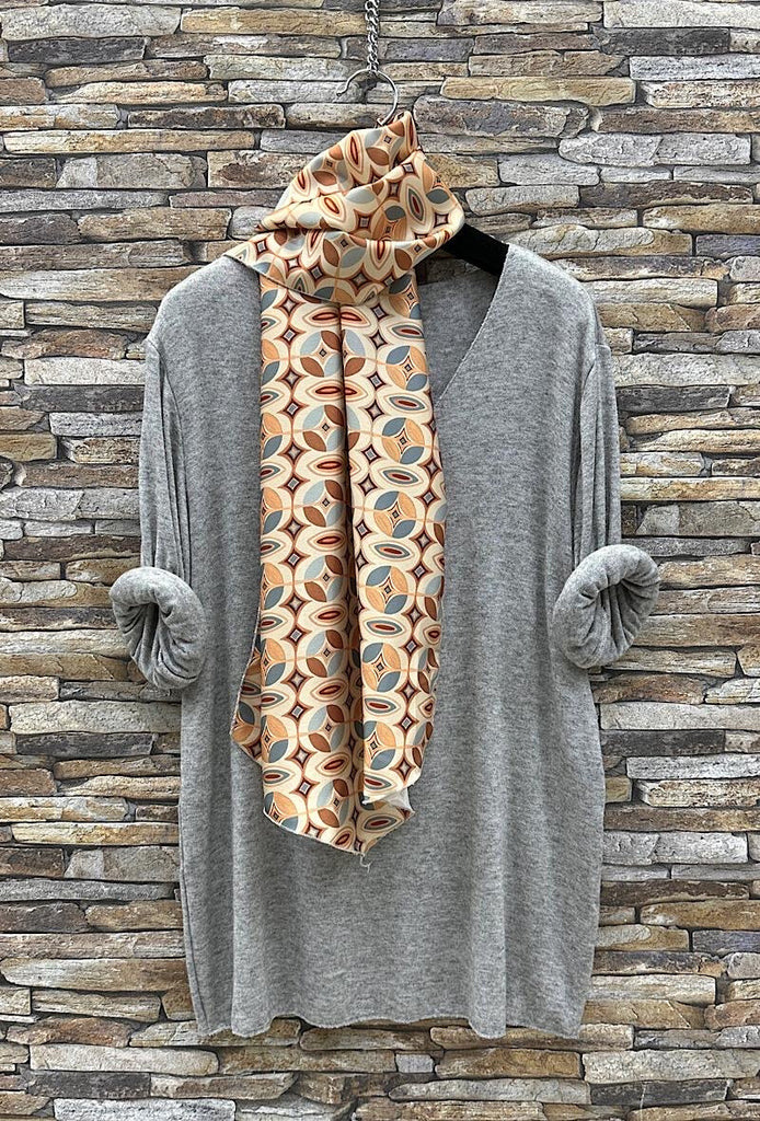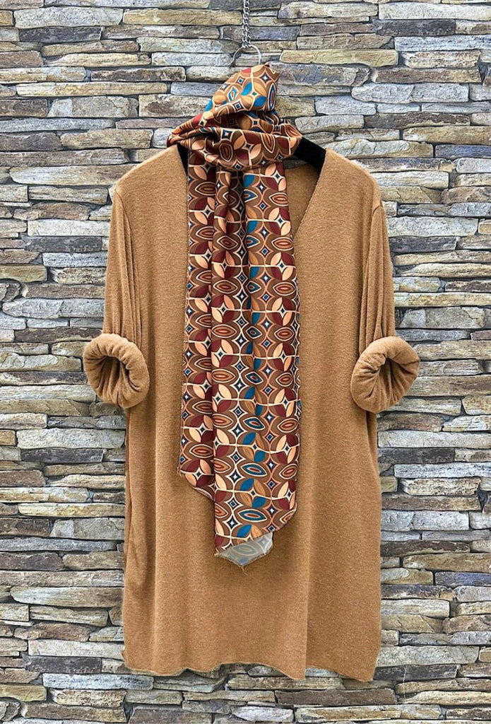 Un pull manches longues tout doux, col en V accompagné d'un foulard à l'imprimé géométriques et aux couleurs assorties.