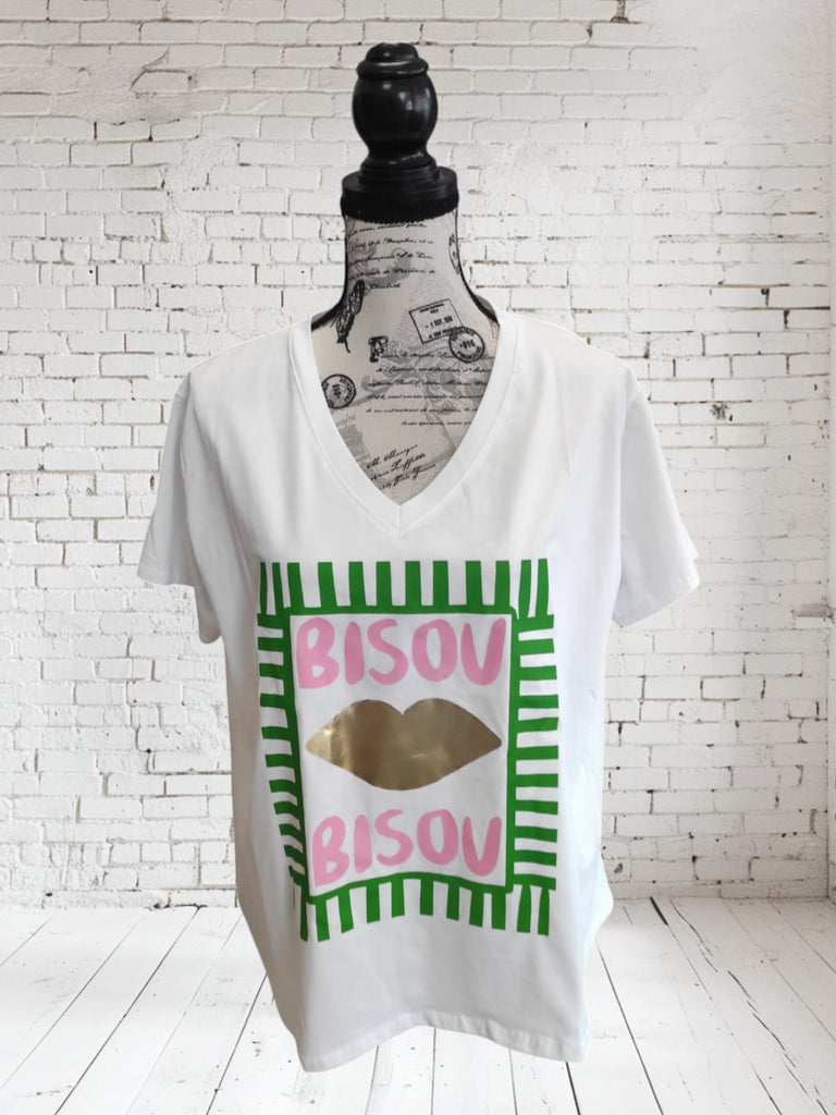 Tee-shirt en coton, col en V, deux tailles uniques intermédiaires du 36 au 44 et du 38 au 46.