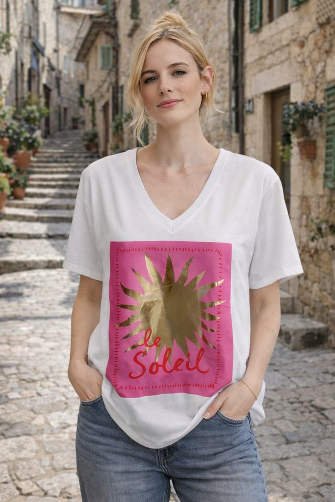 Tee-shirt en coton, col en V, deux tailles uniques intermédiaires du 36 au 44 et du 38 au 46.